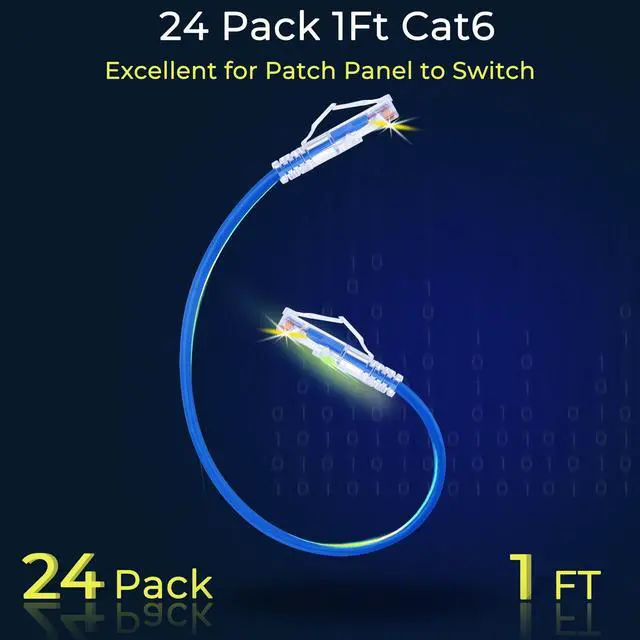 24 Pack24-pack of CAT6a patch cables with short length is excellent solution for connecting patch panel to switch and other various devices in high performance. Available in various colors and length of cable patch cords. ^^ Super SlimThe 28 AWG 1 foot ethernet cable is at least 50% smaller in diameter than 24 AWG cat 6 patch cables. Makes cat 6 ethernet cable 1 ft easy to route through cable management panels. ^^ Widely UseCat 6 patch cables 28AWG is specially designed and have become widely used in data center applications. In fact, Cat 6 cables can be used in all applications where patch cord in need.