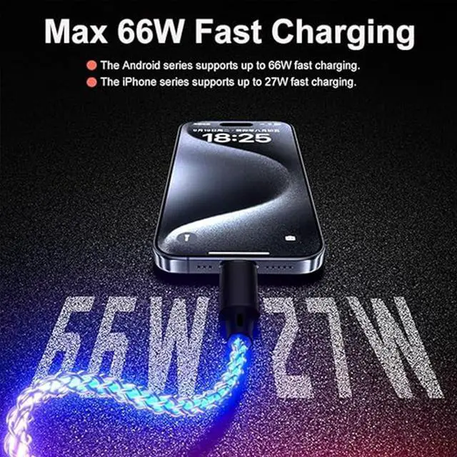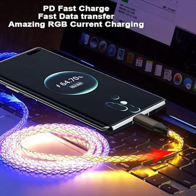 RGB Flowing LED Light UpRGB LED Glowing Gradual Colorful Light Up Flowing charging cable is compatible with Most Cell Phones port devices. New upgraded luminous design, when the LED usb c to type c cable is plugged into the PD/QC power adapter supply, the charger cable is like breathing by itself. ^^ 66W Fast Charging Cable and Data Transfer 66W Light up charging cable adopts pure thick copper inside and smart chips, which makes charging speed up 50% than usual charging cable. And it supports data transmission, which can reach 480Mbps. ^^ Enhanced Durability Our led RGB light up usb type c charger cable adopts aluminum alloy shell micro-arc oxidation process.