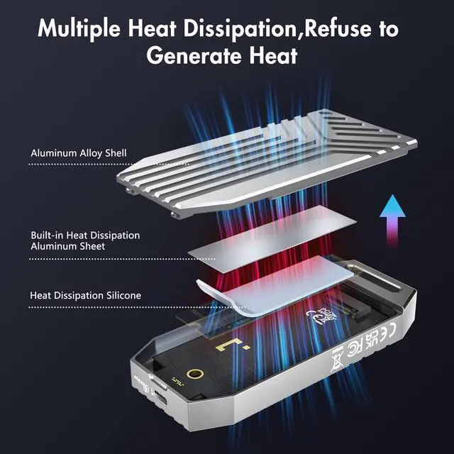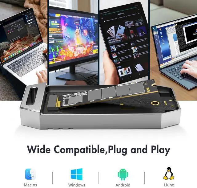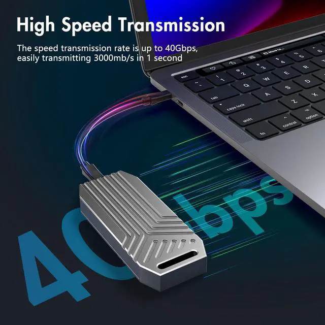Portable Large-capacity Storage SpaceThis SSD enclosure enables data transfer from the SSD to any device with a USB Type-C connector. With a capacity expansion support of 8TB, this enclosure provides ample space to store a vast collection of files, pictures, videos, games, and more. ^^ High-Speed TransferUSB4 Type-C is compatible with Thunderbolt3/4, USB4/ 3.0 / 2.0, and can reach up to 40Gbps transfer rate, providing blazing-fast data transfer speeds. ^^ Composed of Aluminum AlloyThe m. 2 nvme enclosure surface design includes cooling channels. The ssd enclosure can absorb the heat created by the hard drive while protecting it from damage.
