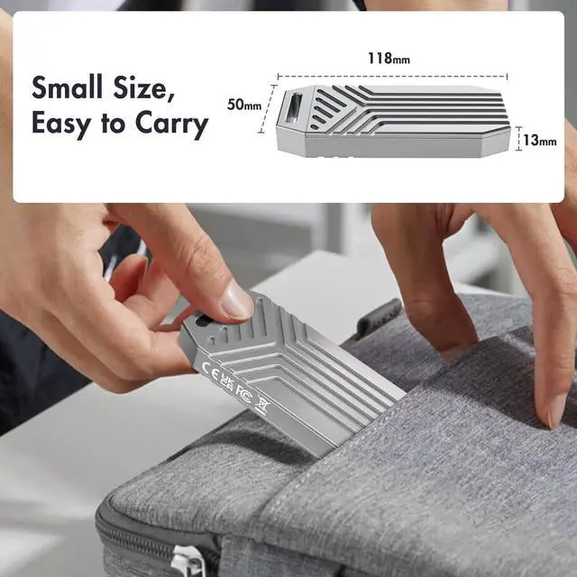 This portable enclosure can easily fit into a pocket or briefcase ^^ Versatile CompatibilityDesigned to accommodate M key and B&M Key PCIe NVMe SSDs, this enclosure supports double-side SSDs in 2280 size (SSDs not included). It is also compatible with various operating systems, including Windows, Mac OS and Linux, enabling seamless data transfer across different devices. Please note that the enclosure does not support AHCI/ SATA SSDs.. ^^ Plug-and-PlayInstall your M. 2 NVMe SSD into the enclosure and connect it to your device with the provided USB cable for fast access.
