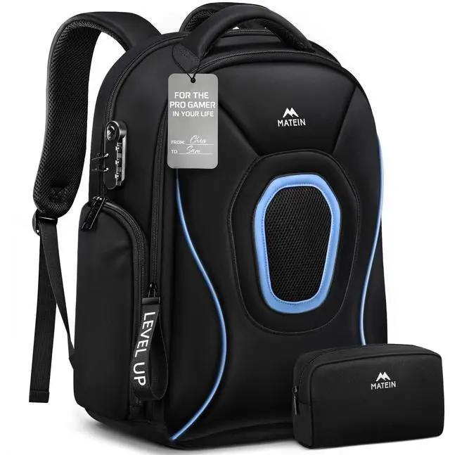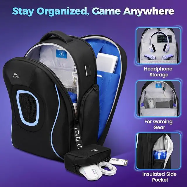 Charging Tech: Smart gaming laptop backpack makes daily carry smarter. It has two side pockets, one insulated to keep drinks warm or cold for hours, and another waterproof one perfect for wet umbrellas. Charge two devices at once with both USB-A and USB-C charging ports. Gaming backpack men features a motivational "Level Up" zipper tag. The sturdy blue frame maintains its shape while carrying 17 inch laptop and gaming gear. Perfect for gamers who want both style and function ^^