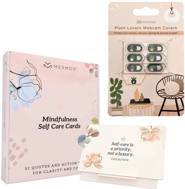 Webcam Covers Feature: 6 webcam covers with different cute indoor plant designs FREE downloadable Plant Lovers Guide Package dimensions 5.5 x 4 inches, weight 0.04 oz 3M tape adhesive, removable without scratching the surface of the device. Compatible with most devices like MacBook Pro, iPhones, Samsung, iPads, Surface etc. Lifetime replacement warrantyYour MESMOS Mindfulness Self Care Cards Feature: 52 positive affirmations cards with motivational quotes Action steps on back of each card 3.3 x 2.1 inches, business card size Foldable stand to display each card Made with thick, high-quality card stock 400g art paper with smooth finish Beautiful box with water color and floral design Shrink-wrapped packaging ( 3.7 x 4.4 x 0.7 inches) *Note: If package doesnot arrive shrink wrapped, please contact us for a new replacement