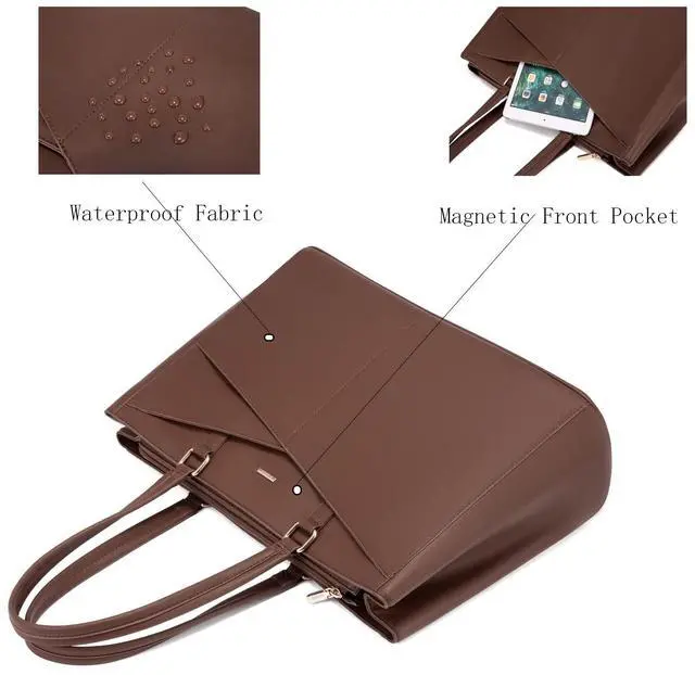 Material Laptop Bag: This computer tote is crafted in durable, water-resistant, scratch-resistant PU Leather and polyester lining. Top smooth metal zipper for easy opening. Metal feet base protects your bag from damage. ^^ Dimension & Chic Practical Tote Bag: Dimension of tote bag is 16.5" L * 5.5" W * 12" H;