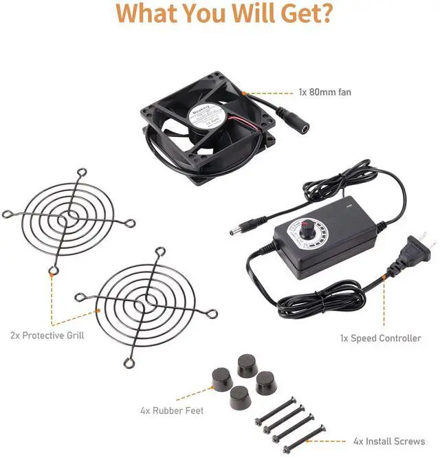• What's in the box1 x 80mm Fan, 1 x Speed Controller, 2 x Fan Grill, 4x Install Screws, 4x Rubber feet
