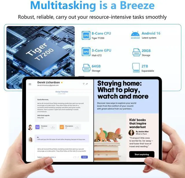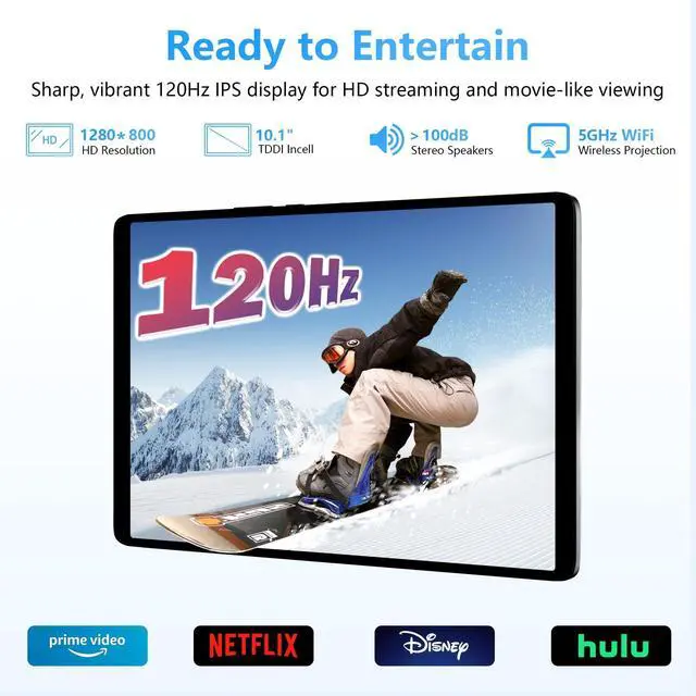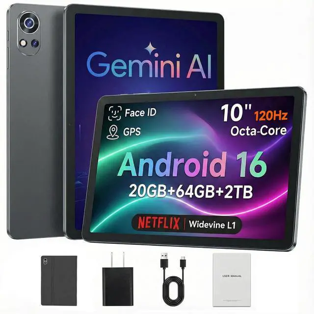 AI-Powered Android 16 Tablet for Everyday ConvenienceRunning the latest Android 16 with Google-certified, this tablet gives you seamless access to millions of apps via Google Play. With 64GB of built-in storage and up to 2TB expandable via microSD (card not included), theres ample space for music, maps, movies, and all your favorites. Plus, the Android tablet is built-in with Gemini AI, acts as your 24/7 smart assistance for whatever email searches, document summaries, image creation, and travel planning. ^^ Fluid 120Hz Display Tablet for Immersive VisualsImmerse yourself in a vibrant 10-inch TDDI IPS display with a fluid 120Hz refresh rate.