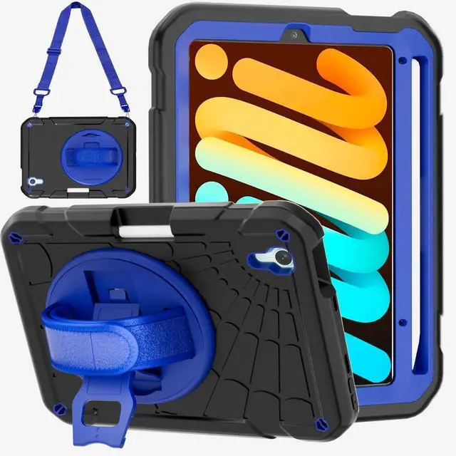 PZJI Case for iPad mini 7 (A17 Pro) 2024/ Mini 6 8.3'' with Pencil Holder [360 Rotating Hand Strap] &Stand, Drop-Proof Case for iPad mini 7th/6th Generation 8.3" (Black+Blue)