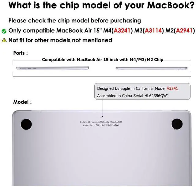 Model: A2941(M2, 2023) A3114(M3, 2024) A3241(M4, 2025). Please check the model number "AXXXX" on the back of your Mac before purchasing. ^^ Anti rupture and anti impactTPU edges are non rigid, not easily broken, and can cushion minor impacts. ^^ Scratch resistant and fingerprint resistantThe matte hard plastic surface is resistant to fingerprints and scratches. ^^ Good heat dissipationDue to many heat dissipation holes at the bottom and sides, as well as anti slip height increasing pads, heat can be fully dissipated during laptop working. ^^ Polishing cloth includedThe package contains a protective cover and a polishing cloth. Polishing cloth will be a good helper for wiping away dust and fingerprints on the screen.