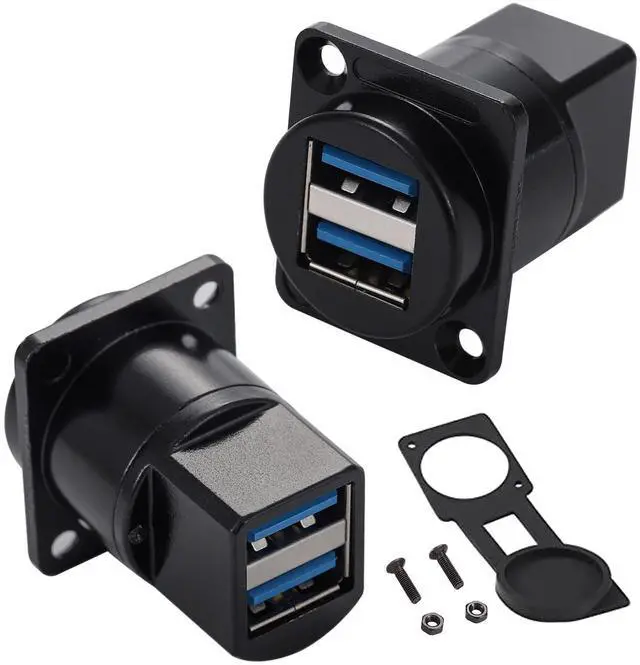 USB 3.0 COUPLERThis two ports Dual USB 3.0 connector is a Female/Female Coupler, Compatible with USB 3.0 / 2.0, with water/dustproof cap, provide a more stable transmission environment for data in the electronic information environment. ^^ EASY INSTALLATIONStandard Connector for Panel-Mount Installations, dual-channel USB signal connection, and save installation space, USB female to female field installable coupler, no soldering, no installation tools, just plug the standard USB head directly for quick installation. ^^ High speedTransmission speed is up to 5.0G bps, Plug and play and enjoy high-speed data transmission with this USB panel mount connector.