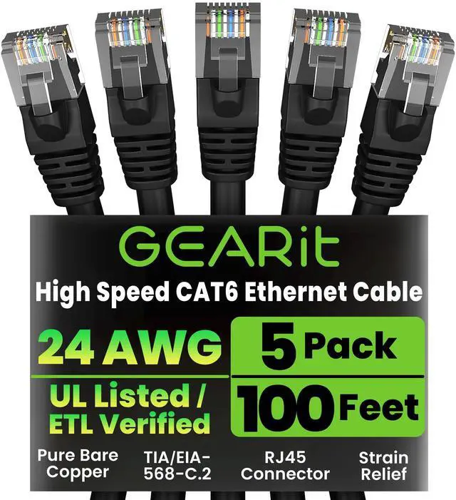 High-Performance Cat 6 Ethernet Cable Pack GEARit's 5-pack of 100 ft Cat6 ethernet patch cables features 24 AWG UTP stranded conductors twisted in an X-structure spline to minimize crosstalk and deliver full 10 Gbps bandwidth - future-proof network cables for home, office, data-center, and server use. ^^ Advanced Cat6 Technology Engineered to meet or exceed TIA/EIA-568-C. 2 standards, these Cat6 ethernet cables offer up to 550 MHz of throughput at a Cat5e price. Fully backwards compatible with Cat5/5e networks and ready for 10-Gigabit Ethernet applications. ^^ Reliable, Secure Wired Connection Say goodbye to Wi-Fi dropouts - this Cat 6 network cable (aka ethernet cable Cat 6 or RJ45 patch cable) provides rock-solid LAN connections for PCs, servers, routers, printers, gaming consoles, and more, ensuring low-latency, interference-free data transfer.