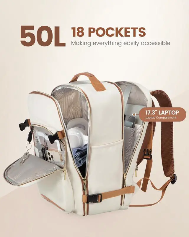 Large Capacity & Multiple Pockets: The travel backpack has a 50L large capacity and 4 main compartments, which can meet daily and travel needs. The travel backpack for women's main compartment can store a lot of things, including 5-8 pieces of clothing, shoes, books, and many other items. The separate laptop compartment is padded with EVA foam to provide the best protection for your 18" laptop and 12.9" iPad. The front compartment has many pockets to keep your belongings organized. ^^