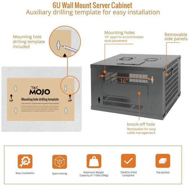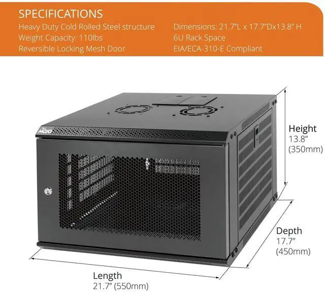Convenient Design: Reversible front door, can be installed on either side to satisfy your door swing orientation preference. Removable top and bottom panels for easy cable management. Compact design of 21.65"L x 17.72"D x 13.78"H and 16inch apart mounting holes are to accommodate stud placement ^^