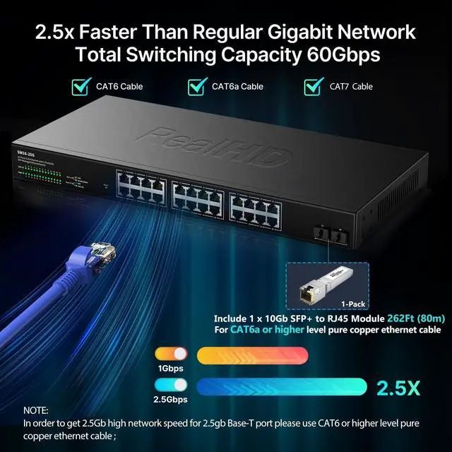 24 Port 2.5G b Managed Ethernet Network Switch ^^ 24 x 2.5 Gigabit ^^ 2 x 10Gb SFP+ ^^ 160Gb Bandwidth ^^ Metal Internet Multigig Switch ^^ Rack Mount ^^ NOT Support VPN ^^ 10Gb SFP+ to RJ-45 Module 262Ft (80m) - 1 Pack