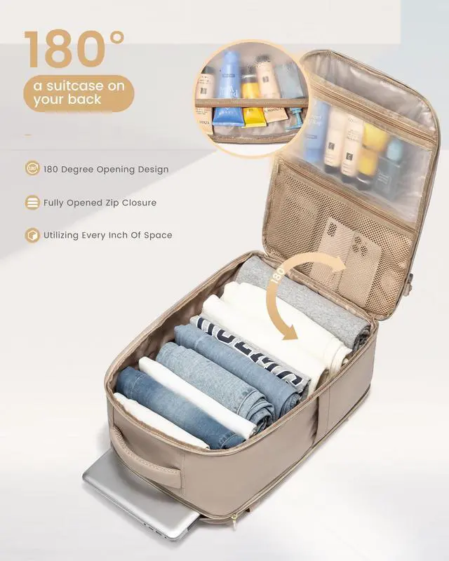 Suitcase: 180opening design, fully opened zip closure, you can rummage through your clothes without destroying everything, utilizing every inch of space. Total of 4 compartments and 16 pockets make everything easily accessible. Pack 3-7 days worth of travel essentials for women with ease. 50l travel backpack for women men: 20*14*8