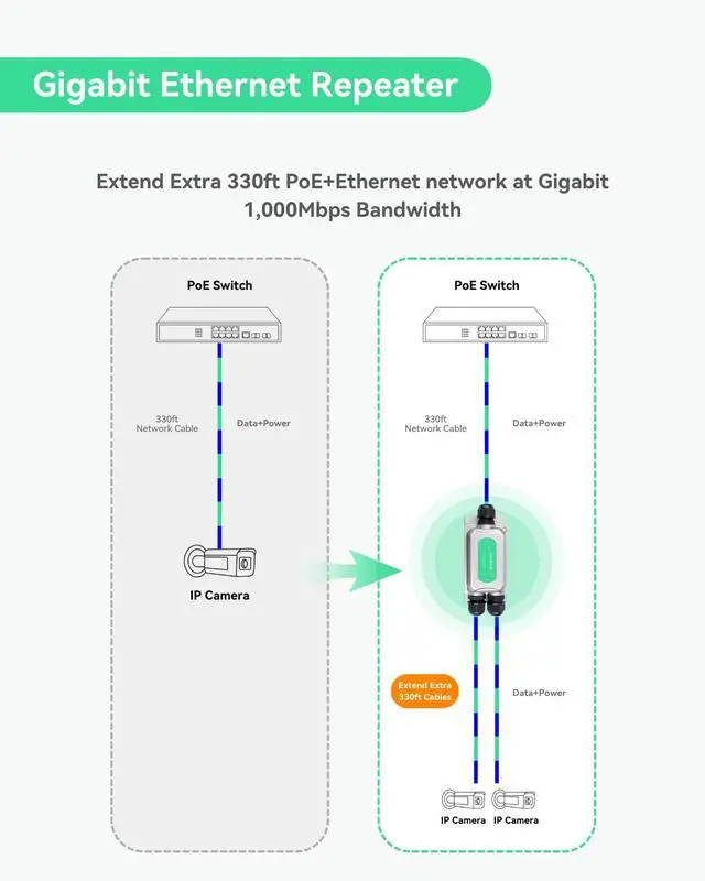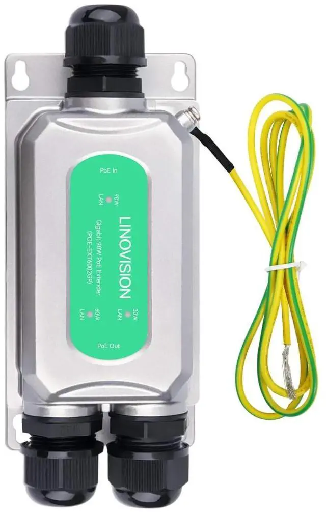 BT 90W PoE EXTENDER - Boost and split BT90W PoE to two PoE outputs (1x 60W + 1x 30W), sufficient power for IP camera, PTZ camera, POE speaker, AP, etc. (Compliant with IEEE 802.3 af/at/bt PoE, does not support 24V PoE) ^^ GIGABIT ETHERNET REPEATER - Extend extra 330ft POE+Ethernet network at Gigabit 1000Mbps bandwidth ^^ OUTDOOR RATED - Aluminum housing, IP67 waterproof standard, 4KV lightning protection, designed for harsh environments. ^^ PoE SPLITTER - Run one network cable to provide PoE power + network for two PoE or non-PoE devices ^^ INTELLIGENT LED INDICATOR - Equipped with an LED indicator for easy checking of the connection status of the device.