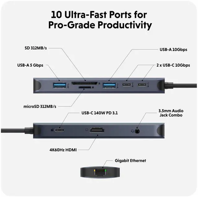 Chromebook: Enhance your productivity and multitasking capabilities with Hyper's travel accessories. By providing a spacious and immersive workspace, this USB-C hub allows users to simultaneously view and work on multiple high-resolution content, such as videos, images, documents, and applications, with smooth and crisp visuals. ^^ Transfer Data at 2X Speeds with 10Gbps