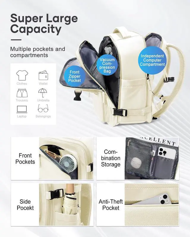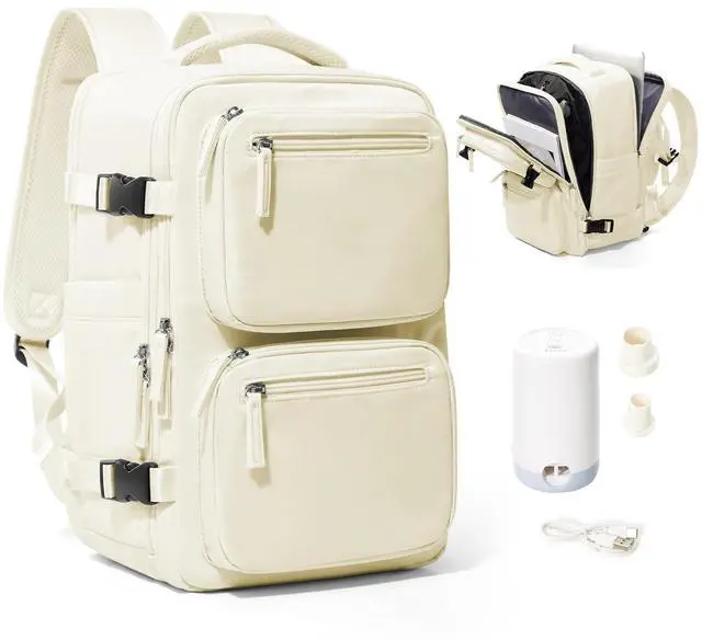 ^^ Multifunctional Storage Compartments: The vacuum compression backpack has multiple storage compartments to give you neat storage space and ensure that everything is in its place. The travel backpack's spacious main compartment holds 13-18 pieces of clothing; the front pocket holds your cell phone, magazines, umbrella and other daily essentials; and the laptop compartment holds a 15.6 -inch laptop and a 9.7 -inch iPad with a padded cushioning layer so you don't have to worry about your laptop.