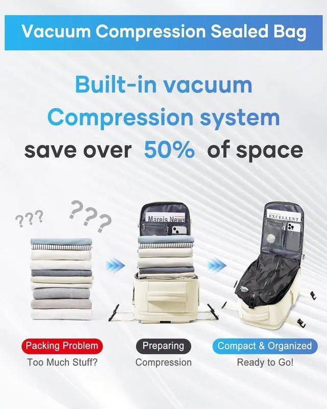 Vacuum Compression Technology: Vacuum backpacks save up to 80% of clothing storage space, reducing the volume of packed clothing and maximizing packing efficiency. Featuring a one-way valve chamber, you can either use an electric vacuum pump for quick compression or manually press to release air. Enjoy optimized space and minimize wasted luggage space.