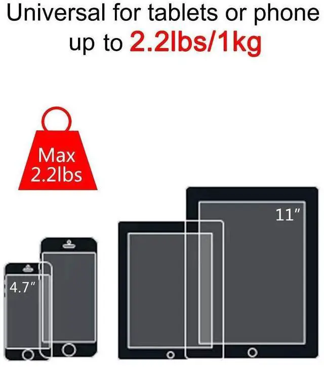 Universal Floor Stand - ideal for most smartphones and tablets with diagonals from 4.7" to 11" that weigh up to 2.2 lbs ^^ Extendable - vertical pole is from 26 to 47", horizontal bar is from 17.5 to 25", holding bracket is from 5.31" to 7.48" ^^ All direction - 360rotation holding bracket with 180swivel horizontal bar to meet any viewing angle ^^ Humanized - reserved charging port to charge while using, hands free for reading, watching movie, etc. ^^ Stable & durable - metal base for stability, premium aluminum frame for durability, non-slip silicon bracket for firm grip