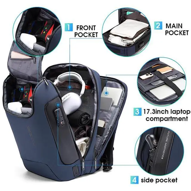 THREE POCKETS WITH MORE FUNCTIONS: Bange upgraded backpack has three separted pockets. The front one can fit one pair of shoes or other personal items, such as power bank, glasses, head set and so on. Per the middle pocket, there is a TSA lock, which can protect your valueable item. The separated laptop compartment can hold one 17.3 inch notebook, and our friendly design can be shockproof and waterproof. It's your best partner during business trip.