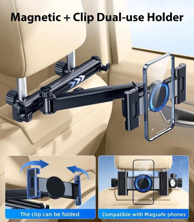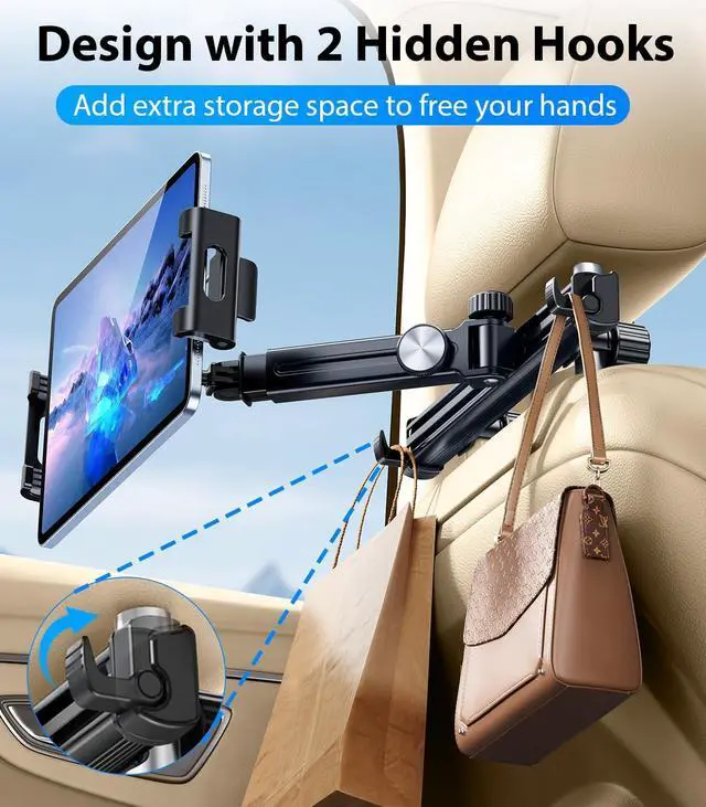 2 in 1 Holder The HIYJEN tablet stand can clip a tablet, and it also comes with a built-in magnetic function that is compatible with MagSafe phones. You can easily pick up and put down the phone with one hand without having to open the clip ^^ Two Built-in Hooks The HIYJEN ipad holder for car backseat is additionally equipped with two foldable hooks at both ends. These hooks can be used to hang items such as bags, wallets, garbage bags, umbrellas, etc., keeping your rear seats neater. Moreover, they can be folded up when not in use, without affecting the aesthetic appearance ^^ Two Extendable Arms The arms of the HIYJEN tablet stand can be freely extended or folded to change the viewing distance.