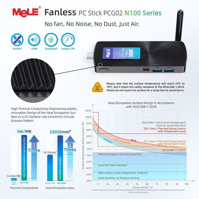 The N100 stick pc is perfect to operate quietly in digital signage, media, or office environments without overheating. ^^ 4K Dual Display & Immersive VisualsThe micro pc hdmi stick pcg02 supports dual screens with 4K UHD resolution at 60Hz via HDMI 2.0 and USB-C (DP 1.4 ) outputs. This hdmi stick enhances productivity and provides an immersive entertainment experience. ^^ High-Speed Connectivity & Vast Expandable StorageEquipped with WiFi 5 ( 802.11 ac), Bluetooth 5.1, and Gigabit Ethernet, the mele mini pc stick n100 offers versatile and high-speed connectivity. It features 8GB RAM 256GB storage, expandable via a Micro SD card slot (up to 1TB) and USB 3.2 Gen 2 ports for connecting external SSD or HDD drives (up to 5TB).