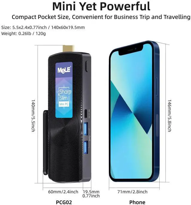 Stick with INTELN100 Processor & Multitasking PowerPowered by N100 processor (4 Cores, Up to 3.4GH z), this fanless mini PC stick delivers a smooth computing experience for daily tasks, office work, and multimedia. Its high efficiency ensures snappy performance for business applications and supports multi-OS functionality, making it ideal for Win11 or Linux, Ubuntu systems in various industry and IoT scenarios. ^^ Fanless & Ultra-Compact Design for 24/7 OperationIts fanless cooling system enables silent, reliable 24/7 operation for MeLE winodows 11 pro fanless pc. The ultra-compact and sleek design ( 5.1 x 2.0 x 0.52 in, 0.26 lbs) eliminates clutter and allows for easy placement behind a TV or monitor.