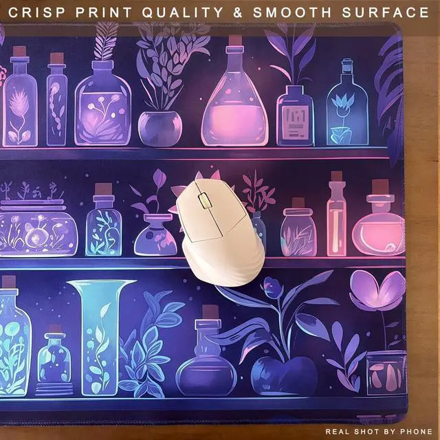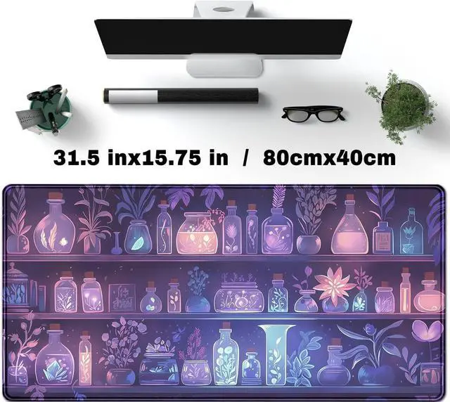 Enchanted Botanical Desk Mat Our mouse pad offers a generous 31.5 x 15.75 inch surface area with 3mm thickness. Features a mystical 3-tier shelf design with preserved plants and glowing crystals in glass jars, transforming your workspace into an arcane alchemist's study. Perfect for both mouse movement and keyboard placement.