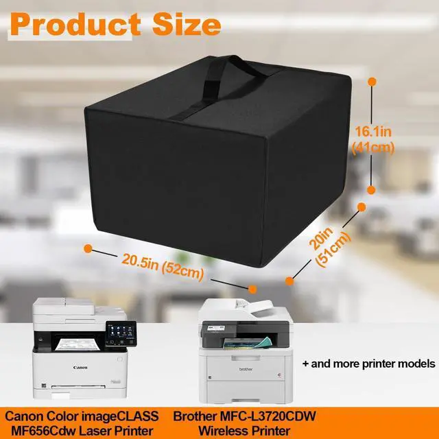 Compatible Models: Fits printers up to (DWH) 20.52116. 1 inches (525141 cm). Printer cover perfectly compatible with Canon Color imageCLASS MF656Cdw Laser Printer/Brother MFC-L3720CDW Wireless Printer, and other similarly sized appliances.