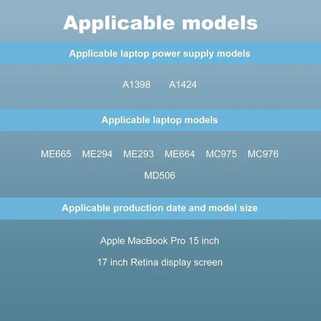 This T-Tip power adapter supports 85W and 60W outputs, providing fast and stable charging. It is compatible with major models including A1435, A1502, A1424, A1398, and ME294, making it ideal for 13 inch/15 inch MacBook Pro (late 2012-2015) and 2012-2017 MacBook Air equipped with Retina display.