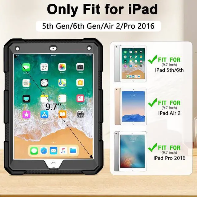 Precise Matching Dedicated to 9.7 -inch iPad, compatible withiPad 6th Generation 9.7 inch 2018 ( A1893 / A1954 ), for iPad 5th Generation 9.7 inch 2017 ( A1822 / A1823 ), for iPad Air 2 ( A1566 / A1567 ) and fit for iPad Pro 9.7 inch ( A1673 / A1674 / A1675 ); Only applicable to the two specified models mentioned above. Please verify the model before purchasing. ^^ Strong Protection Professional anti fall design, high elasticity silicone outer layer cushioning impact, reinforced PC inner layer compression and bending resistance, and four corner thickening treatment provide comprehensive protection.
