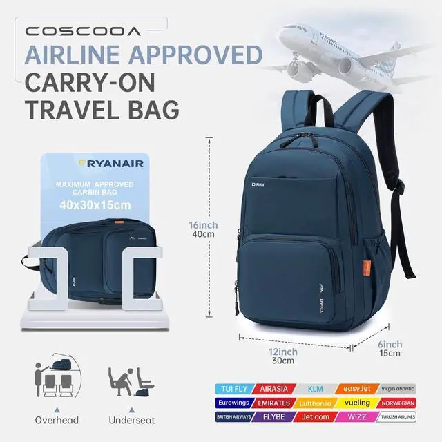 Airline Approved Personal Item Travel BackpackThe size of the COSCOOA Travel backpack corresponds exactly to the maximum size that can be taken in the cabin on flights with Ryanair 40x30x15cm/20L. It is approved by most airlines including Ryanair, United Airlines and Frontier Airlines.