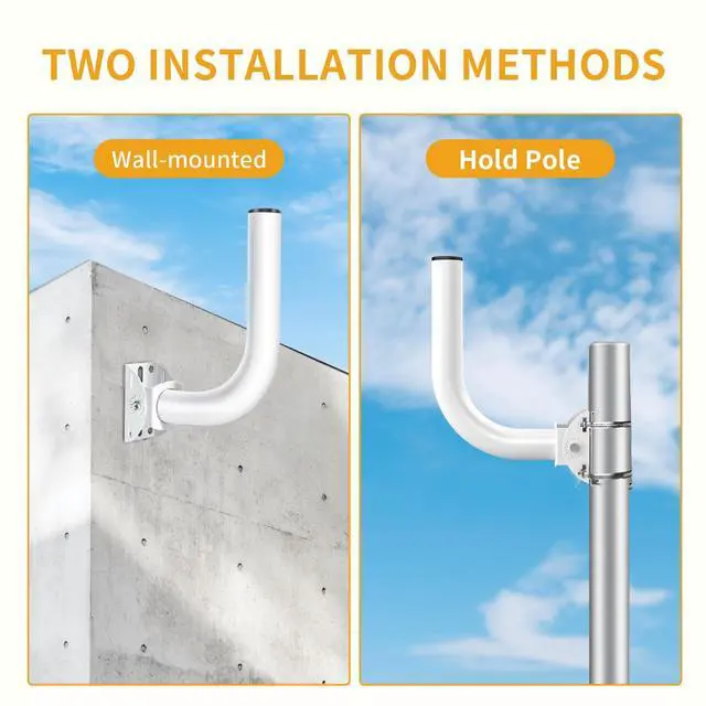150 Degree Adjustment Mount -The wireless bridge mount pole can be adjusted 150up and down. After you install the CPE or antenna, adjust the angle of the pole to receive a stronger signal ^^ Stability for Piont to Point Wireless Bridge - This TV antenna mount comes with non-slip gears. After adjusting the angle of the pole, you only need to give it a slight twist and the pole will be securely fixed. And this pole mount bracket is equipped with two hoops, which can completely secure your bracket firmly to the pole ^^ Two installation methods - This pole mount bracket can be mounted on either a wall or a pole, giving you the flexibility to choose the installation method that best suits your needs.