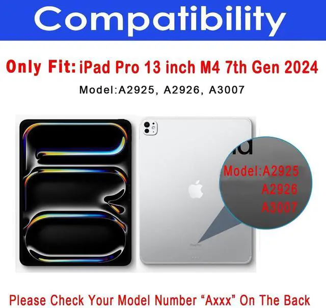 Compatibility: This Wireless Bluetooth keyboard case cover only fits iPad Pro 13 Inch M4 7th Generation (2024 Released) (Model:A2925, A2926, A3007). Please be kindly check your iPad back model before purchasing. (The pen is not included)