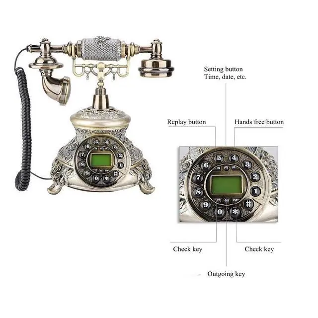 MS-5700D EUROPEAN RETRO ANTIQUE TELEPHONEVintage European telephone with copper color design and hollowed out details is a good decoration whether it is placed at home, bedside, or in the study, or in the store. The LED screen displays electronic calendar, date, clock and day of the week, giving you a different retro phone experience ^^ DUAL SYSTEMThis retro vintage telephone is compatible with two system modes,, DTMF dual system, easy to use. It is powerd by 3*AAA batteries. The call quality is clear and noise, full of classic and retro ^^ PRE DIAL NUMBERThe pre dial number is 32 bits long and supports 1 set of automatic IP.