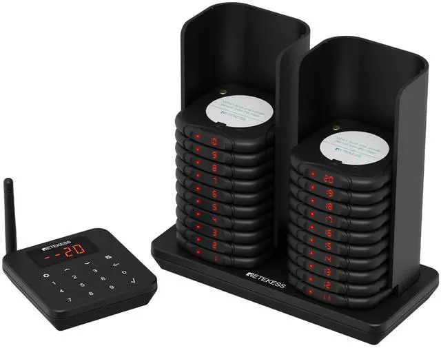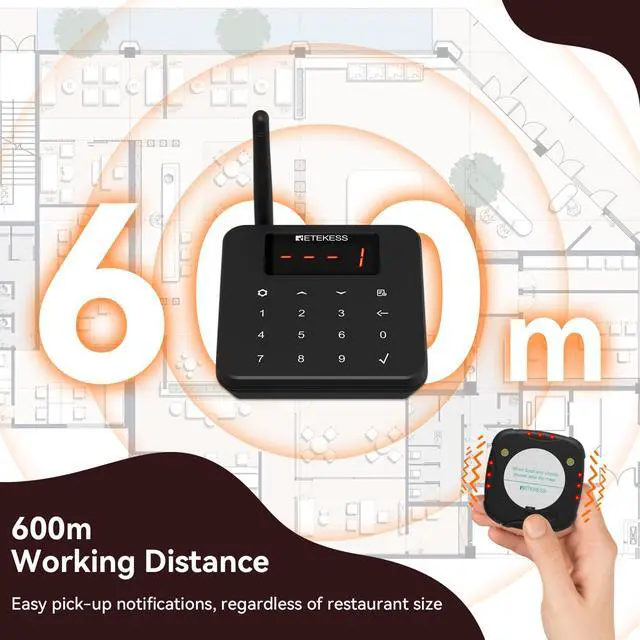 Anti-tip design; solves the tipping problem of stacked charging food dispensers; while allowing restaurant pager to be retrieved from the top or pulled out from the bottom; offering greater flexibility and convenience ^^ 1966ft working distance; extra-long working range; ensuring that no matter the size of your restaurant; customers can easily receive food pickup notifications of restaurant buzzer from any corner ^^ Upgrade your dining experience; our pagers for restaurants are equipped with a unique silent button; allowing customers to enjoy a more thoughtful dining experience; This feature helps maintain a peaceful; elegant atmosphere in your restaurant ^^ Over 600m automatic alert; if a customer accidentally takes the restaurant pager beyond 600m range it will automatically ring and cannot be muted; This smart feature helps prevent pagers from being taken away; reducing the risk of loss ^^ 64 combinations; restaurant buzzer features adjustable settings for bell sound; vibration; and flashing light; offering three levels (large, medium, small); This system ensures seamless communication between your staff and customers