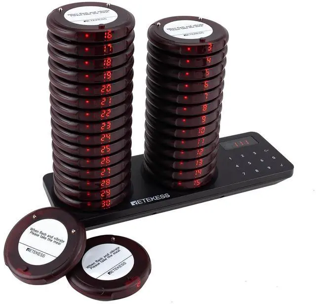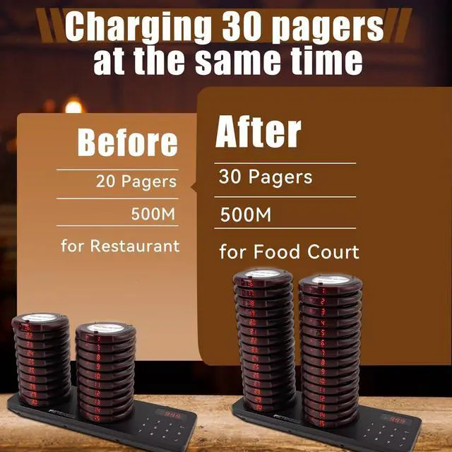 Long working distance; the restaurant vibrating pagers working range can reach 500m/1640ft in open areas; customers can wait in a comfortable area or in their own car ^^ 31 prompt modes; buzzer; vibration and flash can be combined at will; different speed modes can be selected; set the prompt mode as your need ^^ 30 pagers and dual charging base; staff paging system; you can charge 30 pagers at the same time; makes it easier to expand your business ^^ Add up to 998 pagers; the church nursery pager system can add up to 998 pagers; you can expand your business easily ^^ Indicator light; the wireless pager system will flash when charging; and the light will stay on when fully charged; it is easy to know the charging condition