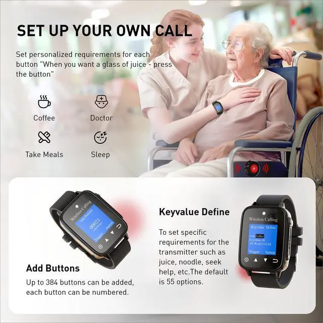 Define): "When you want a glass of juice/withdrawal of needle/nurse", the wireless nurse watches can set personalized requirements for each button, press the button and call with one key. ^^ 4