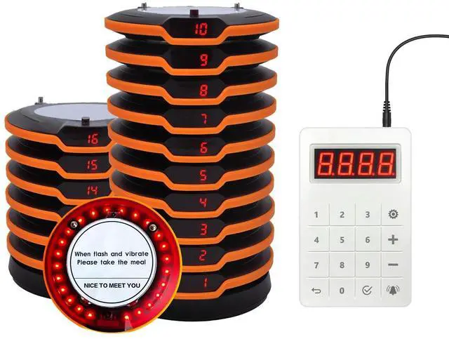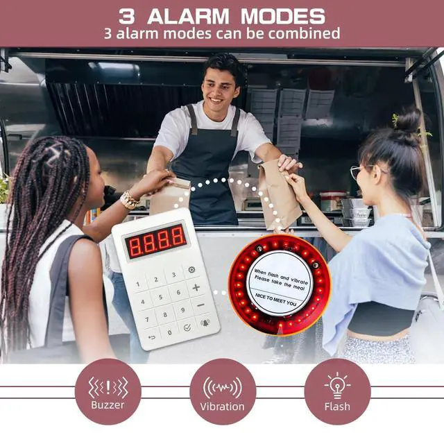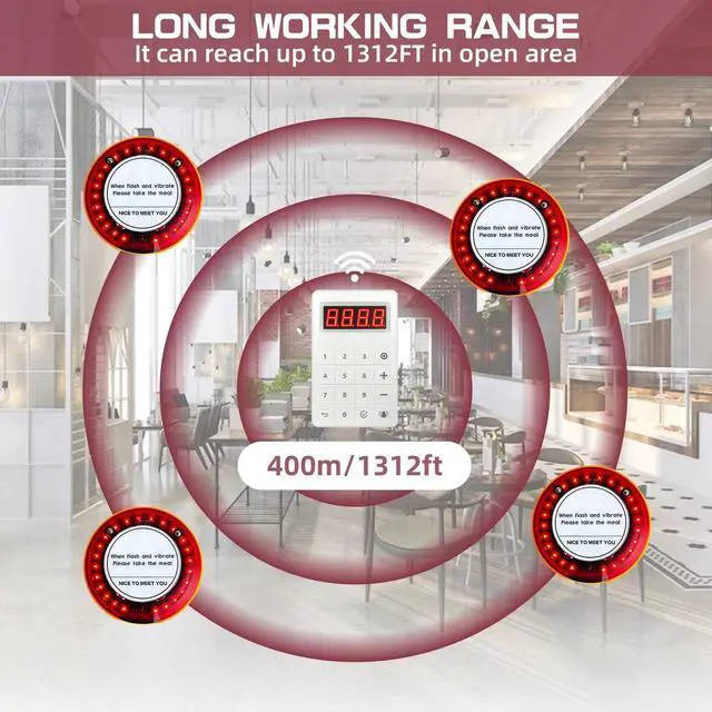 LONG-RANGE WIRELESS PAGER SYSTEM FOR FOOD TRUCKS & RESTAURANTS Maximize your business efficiency with our long range restaurant coaster pager system. Its 1312ft coverage in open area makes they are ideal for busy food trucks, drive-thru pickup zones, and curbside service. Eliminate crowded queues and enable contactless car-side notifications for parking lot waiters. Perfect for Food truck festivals, Drive-in theaters, Outdoor catering events and High-volume food courts. ^^ MULTI-ALERT NOTIFICATION SYSTEM Customize alerts with 3-in-1 vibration + LED flash + audible beep This restaurant pager system buzzers are designed for noisy kitchen environments (loud buzzer mode cuts through chaos), discreet VIP service (vibrate-only for upscale dining) and visual allergy alerts (color-coded flashing for special orders).