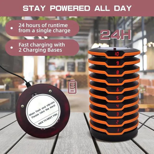 ^^ EXTENDED BATTERY LIFE FOR ALL-DAY OPERATIONS 24-hour continuous use on single charge, the food truck buzzers can be fast charged by 2 smart charging station, which can powers 16 pagers simultaneously. Makes the guest customer queue Pagers are ideal for pizza delivery hubs, farmers market vendors and coffee shop rush hours.