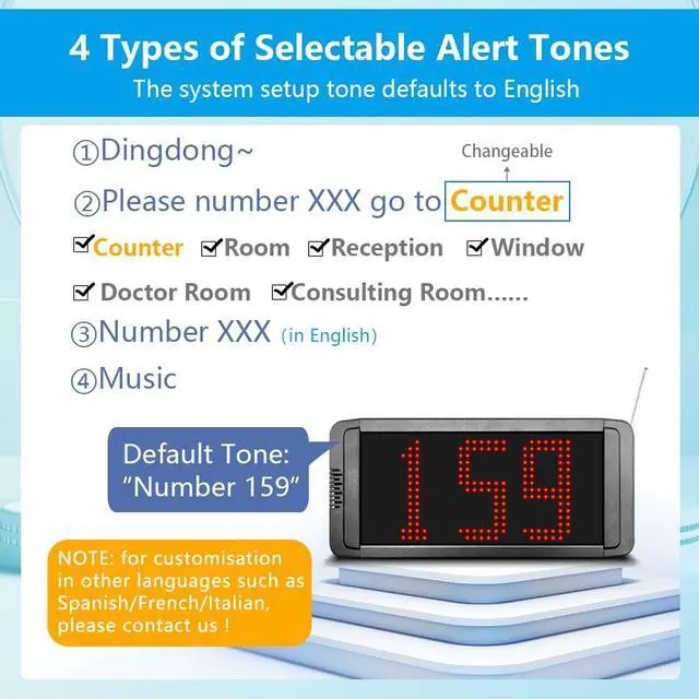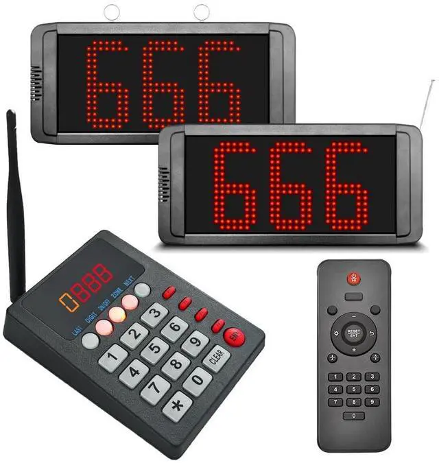 If you would like to add additional quantities, please contact us. ^^ Long DistanceThis waiting number system has a signal coverage of about 1, 000 feet in an open field, and even indoors where there are obstacles, the signal coverage can reach about 100-150 feet. Particularly suitable for small and medium-sized 1-3 storey buildings. ^^ Clearly Visible Numbers The display uses high-brightness light beads that can be seen in sunlight. But it isn't waterproof and prolonged exposure to sunlight can easily shorten its life. ^^ Double ReminderWhen the keypad calls a number, both displays will show the number and voice prompts at the same time, suitable for waiting areas with large space.