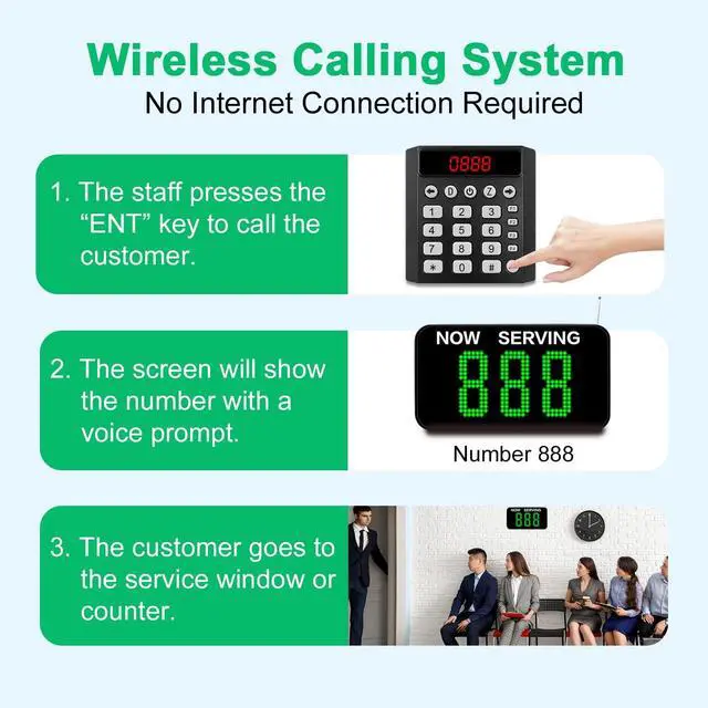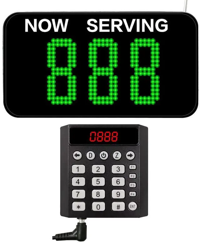How It Works Press the corresponding number key to call the customer when it's their turn. The screen will show and broadcast the number, the customer will then go to the service window. A single keypad can simultaneously call multiple displays, while multiple keypads can also call a single display.