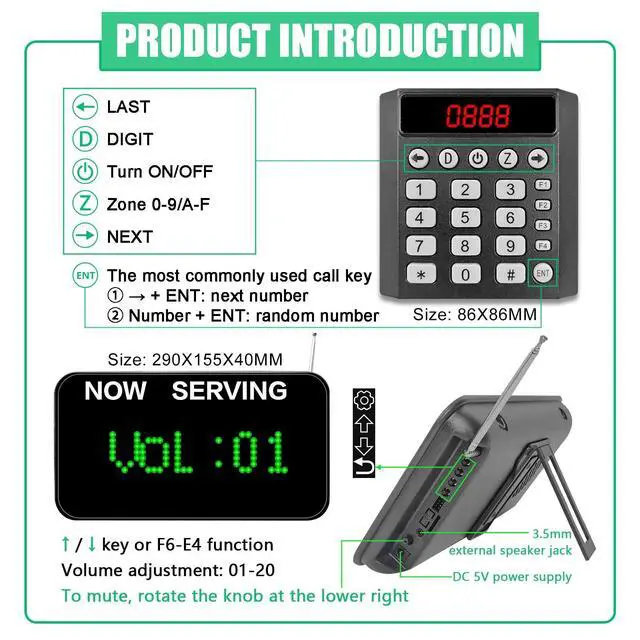 KOQICALL Take a Number System Wireless Queue Calling System Green 3-Digit Ticket Number with 1 Keypad Caller 1 Now Serving Display for Restaurant Office Clinic Bank Waiting Line Management