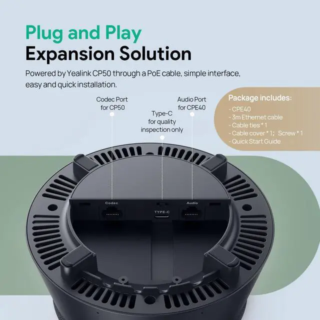 ^^ Package Includes: Yealink CPE40 speaker with mic 13m Cat5 Ethernet Cable 1Quick Start Guide 1; Cable Tie 1; Cable Organizer Cover 1; Screws 1. Military-grade durability aluminum casing withstands daily office wear.
