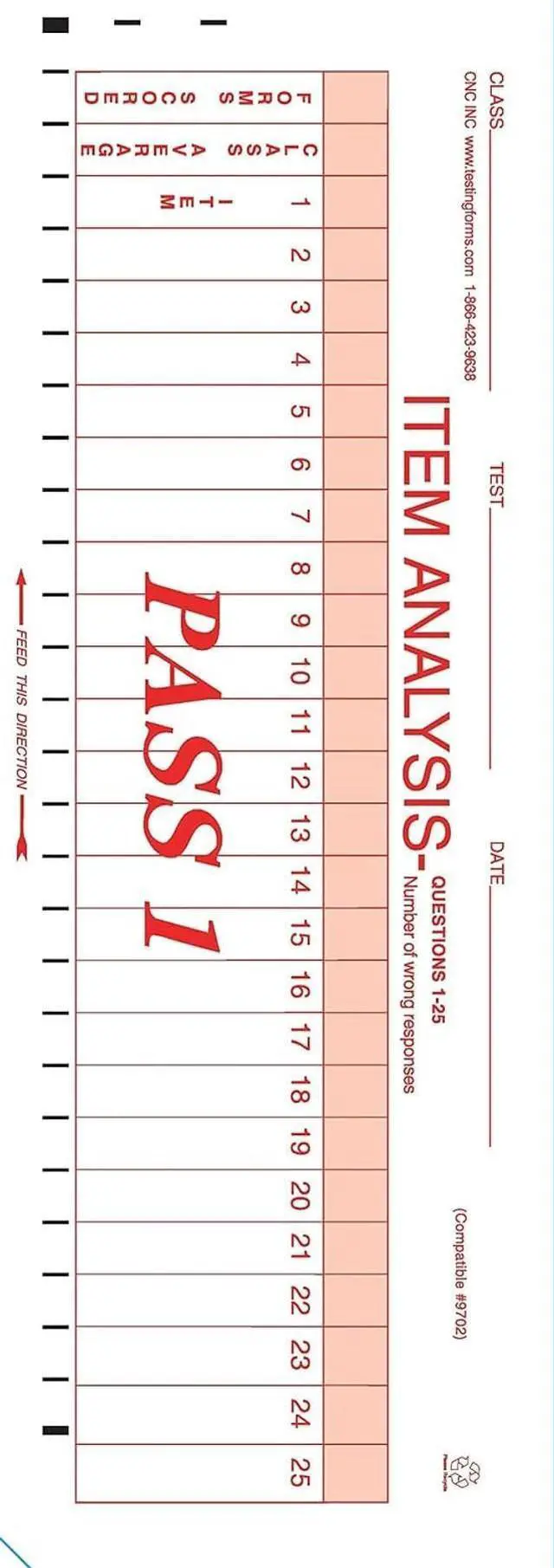 Qty 100 - 50 Question Scantron 9702 Compatible Item Analysis Forms 1-25 on front 26-50 on the back. These forms will work with tests that are less than 100 questions such as the 881 and the 889. These forms are 4"x12" Compatible with the Scantron 888P+ Scanner. 100% Guaranteed 9702 25 question each side Scantron 888P This form is run through after all the test have been run through and will give the instructor a better overview of the test for the class. Forms Scored, Class Average and the the number of tests that incorrectly marked a particular question.