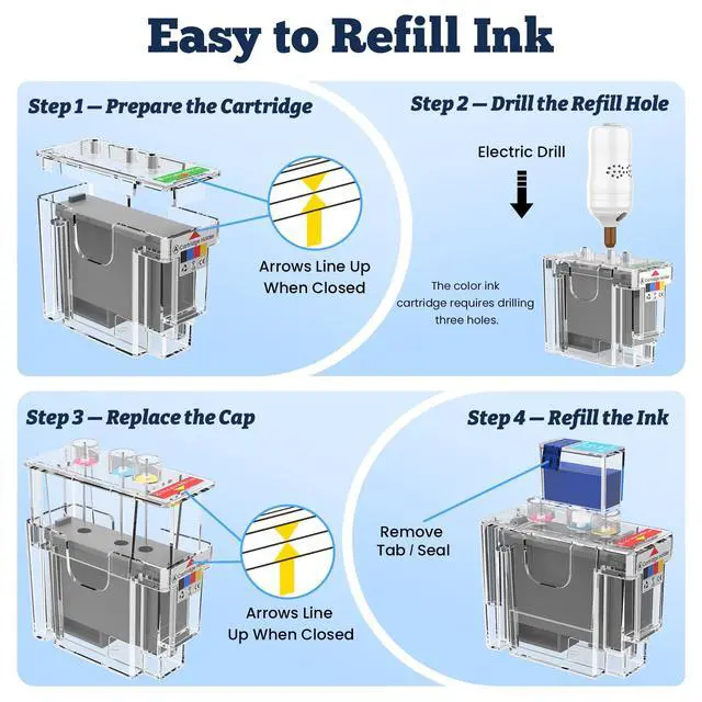 Clean Refilling: The ink refill kit includes gloves and a safety drill to minimize ink spills. Step-by-step instructions and video tutorials guide you through a safe and clean refilling process. Supports individual color refills so every cartridge is fully utilized.