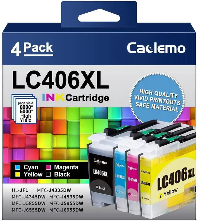 1. NEWEST CHIPSLC406XL Ink Cartridges for Brother Printer for Brother LC406XL LC 406XL LC406 Ink Cartridges with Latest Upgraded Chips to meet compatibility with your printer ^^ 2. Extra-large CapacityUP to 6, 000 pages per LC406XL LC 406XL Black Ink Cartridge (LC406XLBK) and 5, 000 pages for LC406XL LC 406 XL Color Ink Cartridge LC406XLC LC406XLM LC406XLY High Yield Ink Cartridge (A4 Letter, at 5% Coverage) ^^ 3. Compatible PrintersLC406XL Ink Cartridges for Brother Printer and LC406 Ink Cartridges for Brother Printer also compatible with Brother MFC-J4335DW, MFC-J4335DW XL, MFC-J4345DW, MFC-J4345DW XL, MFC-J4535DW, MFC-J4535DW XL, MFC-J5855DW, MFC-J6555DW, MFC-J6955DW, MFC-J5955DW, HL-JF1 Printer ^^ 4.
