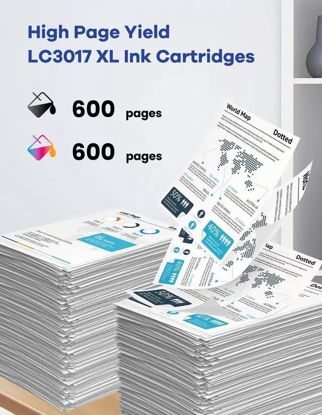 Use: Our LC3017 XL ink cartridges are designed for easy installation and use, so you can spend less time troubleshooting and more time printing. Simply pop them in, and you're ready to go ^^ Reliable