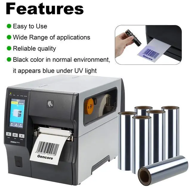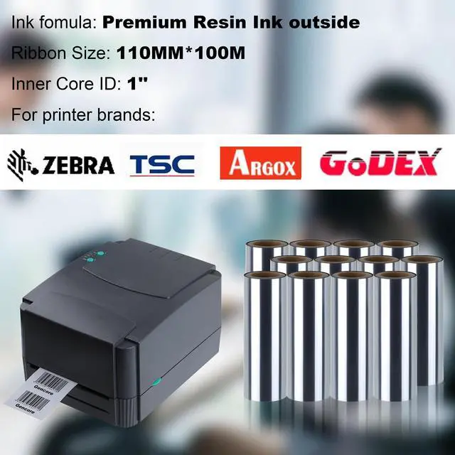 Compatibility: 4.33 '' x 328' (Width 110mm x Length 100m), Core size 1", ink outside. Compatible with most industrial model and some desk-top model thermal transfer printer, such as Zebra TSC GoDEX.
