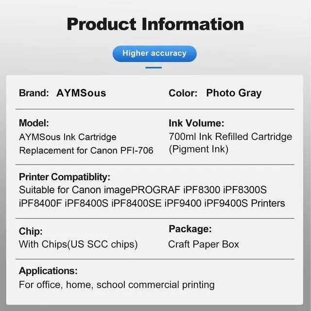 Package Contents: 1 Pack Photo Gray 700ML PFI-706 Pigment ink cartridge with SCC chip ^^