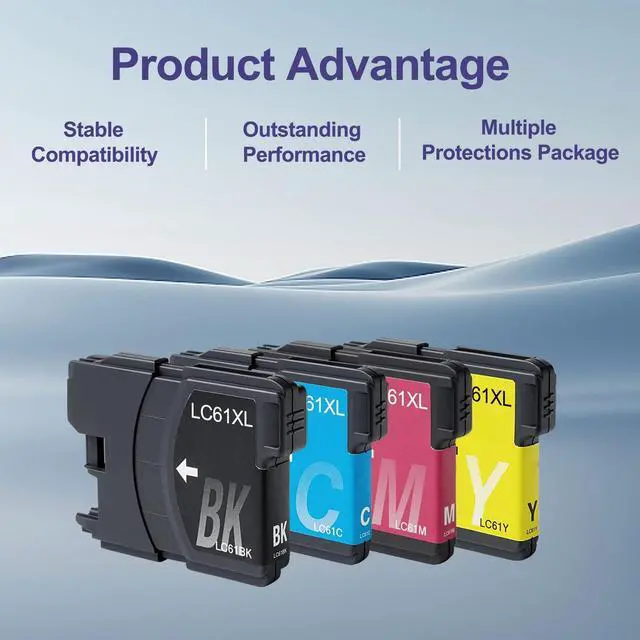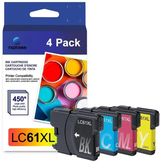 What's in the box: LC61XL Ink Cartridge Set 4 Pack includes 1 x LC61XL Black ink, 1 x LC61XL Cyan ink, 1 x LC61XL Magenta ink, 1 x LC61XL Yellow ink ^^ LC61 ink cartridge to use with: DCP-165C DCP-375CW DCP-385CW DCP-395CN DCP-585CW DCP-J125 DCP-J140W MFC-250C MFC-255CW MFC-290C MFC-295CN MFC-490CW MFC-495CW MFC-5490CN MFC-5890CN MFC-5895CW MFC-6490CW MFC-6890CDW MFC-790CW MFC-795CW MFC-990CW MFC-J220 MFC-J265W MFC-J270W MFC-J410W MFC-J415W MFC-J615W MFC-J630W ^^ Cartridge high yield (approx. ): 450 pages per LC61BK black ink; 325 pages per LC61CL color ink (cyan/magenta/yellow) ^^